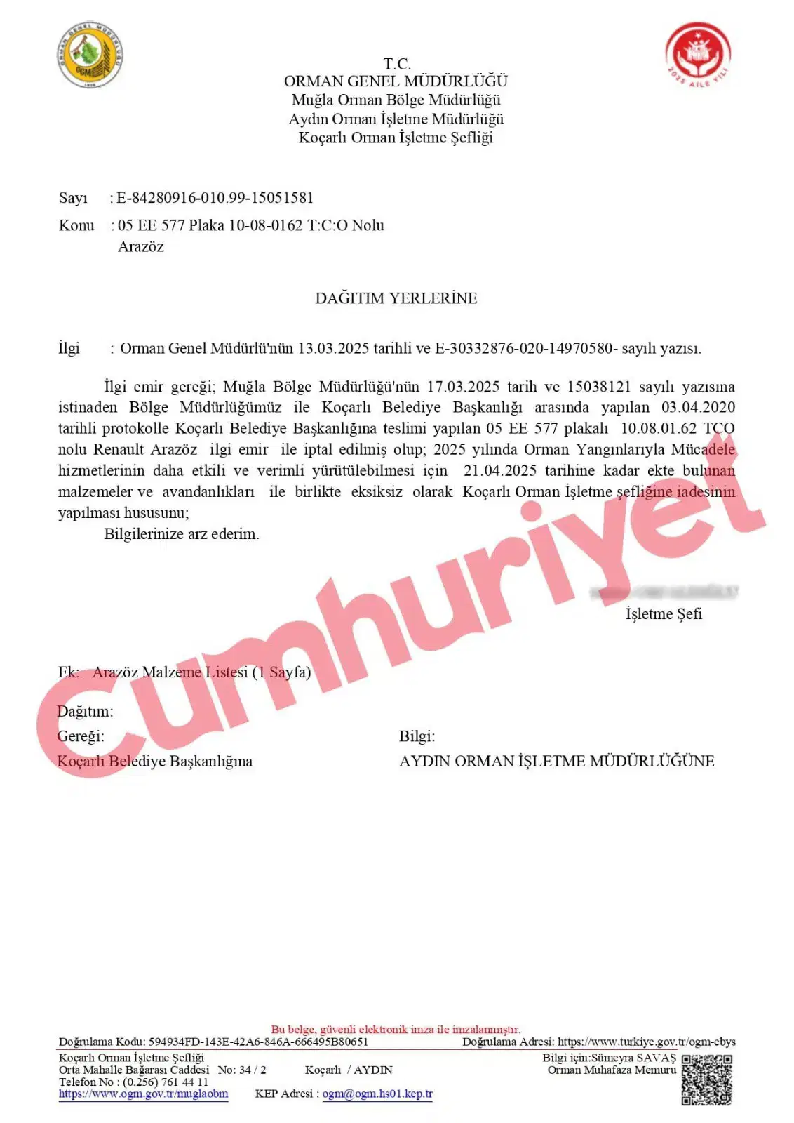 Orman Genel Müdürlüğü’ne bağlı biriminden gönderilen yazıda aracın geçici tahsis kapsamında verildiği ve gerektiğinde geri çağrılabileceği ifade edildi. Cumhuriyet’in ulaştığı belgede, geri alımın gerekçesi “yangınlarla etkili ve verimli mücadele” olarak açıklanırken kararın seçim sonrasında ve yangın sezonu öncesi alınması dikkat çekti.