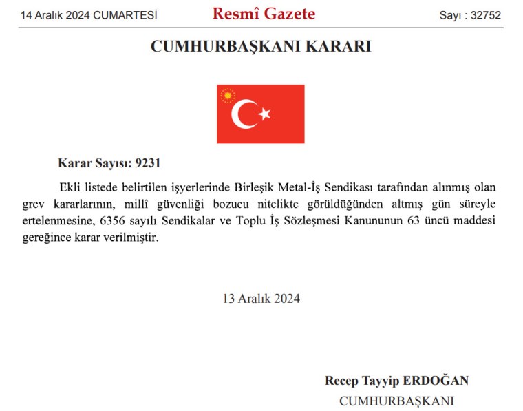 “Birleşik Metal-İş Sendikası tarafından alınmış olan grev kararlarının, milli güvenliği bozucu nitelikte görüldüğünden altmış gün süreyle ertelenmesine, 6356 sayılı Sendikalar ve Toplu İş Sözleşmesi Kanununun 63’üncü maddesi gereğince karar verilmiştir.”
