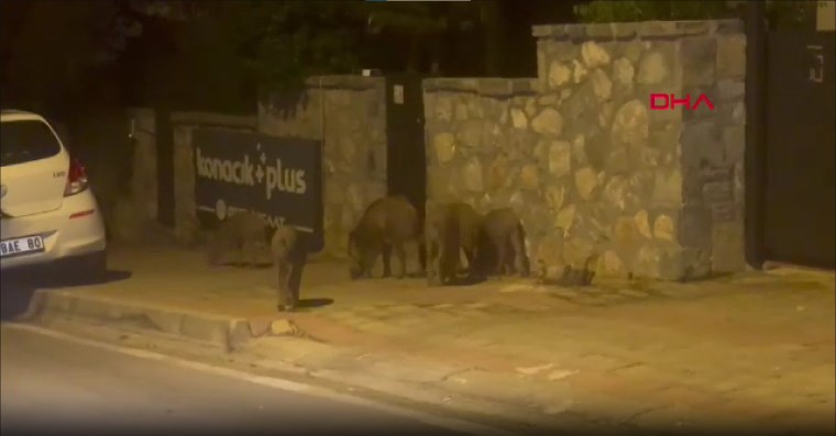 20 domuzun yer aldığı sürüsü, daha sonra sitelerin bulunduğu bölgeye gitti. Burada da bir süre yiyecek arayan domuzlar, daha sonra ormana dönerek gözden kayboldu. O anlar bir vatandaş tarafından telefonu kamerasıyla görüntülendi.