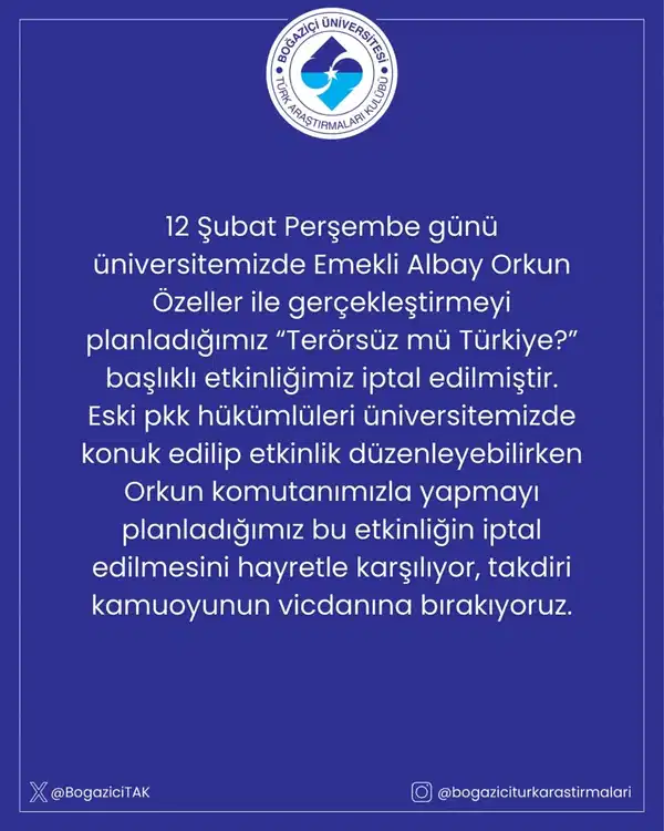 Yeni çözüm sürecine yönelik açıklamaları nedeniyle bir süre tutuklu kalan emekli albay ve yazar Orkun Özeller’e karşı yeni bir engelleme de kayyım tarafından yönetilen Boğaziçi Üniversitesi’nde yaşandı. Boğaziçi Üniversitesi Türk Araştırmaları Kulübü, 12 Şubat’ta Özeller ile yapılması planlanan “Terörsüz mü Türkiye” konferansının okul yönetimi tarafından iptal edildiğini duyurdu. Topluluk, karara “Eski PKK hükümlüleri üniversitemizde konuk edilip etkinlik düzenlenebilirken, bu etkinliğin iptal edilmesini kamuoyunun vicdanına bırakıyoruz” açıklamasıyla tepki gösterdi. Özeller, iptal kararını ve yaşananları gazetemize değerlendirdi.