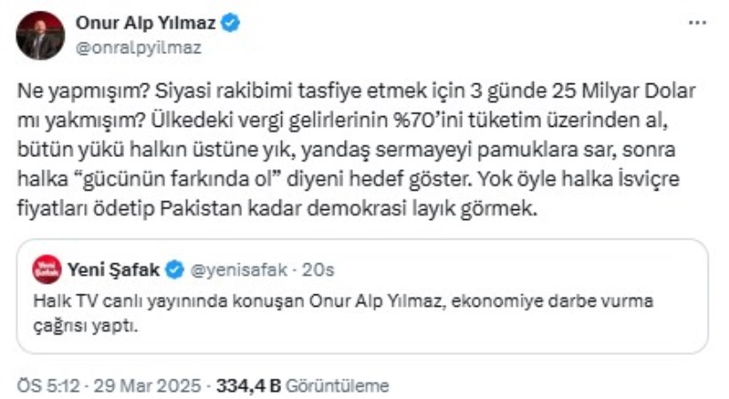 Yılmaz, sözleri üzerine AKP’ye yakın Yeni Şafak’ın kendisini “Halk TV canlı yayınında konuşan Onur Alp Yılmaz, ekonomiye darbe vurma çağrısı yaptı” ifadeleriyle hedef göstermesi üzerine sosyal medya hesabı üzerinden şöyle tepki göstermişti:
