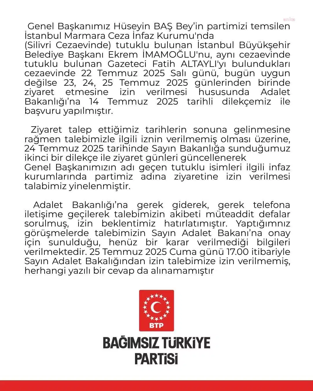 Bağımsız Türkiye Partisi’nden (BTP) yapılan açıklamaya göre, Genel Başkan Hüseyin Baş’ın Silivri’de tutuklu bulunan Ekrem İmamoğlu ve Fatih Altaylı’yı ziyaret taleplerine izin verilmediği bildirildi.