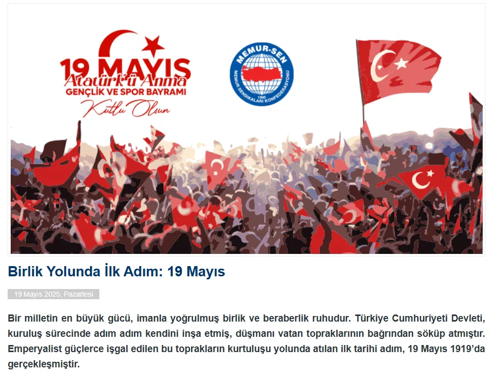 Memur-Sen’in sosyal medya mesajında da, “Bağımsızlık yolunda ilk adım 19 Mayıs 1919” yazılı Türk Bayrağı görseli ile paylaşım yapıldı. Ancak Atatürk ismi orada da yer almadı.