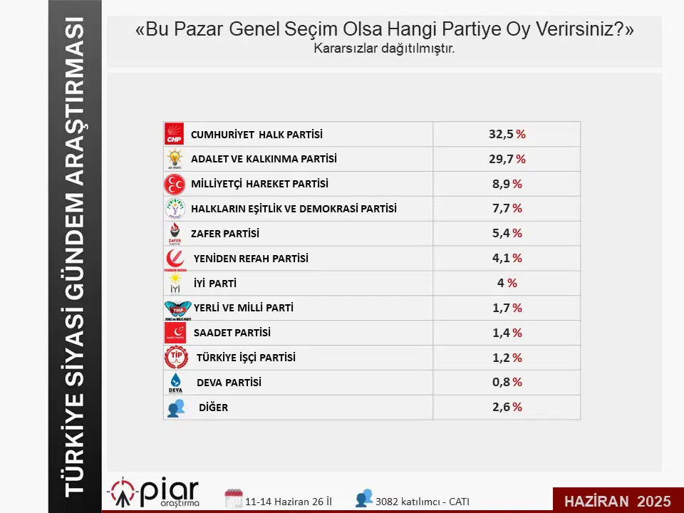 PİAR Araştırma, 11-14 Haziran tarihlerinde 26 ilde, 3 bin 82 katılımcı ile gerçekleştirdiği anketin sonuçlarını yayımladı.