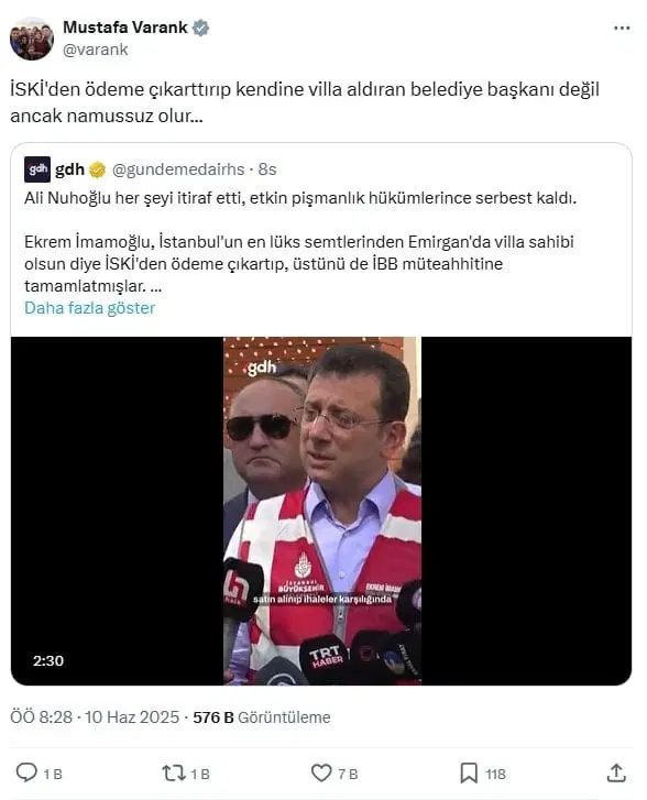 Varank, “İSKİ’den ödeme çıkarttırıp kendine villa aldıran belediye başkanı değil ancak namussuz olur…” ifadelerini kullandı.