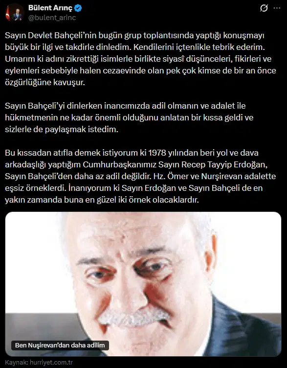 Bu kıssadan atıfla demek istiyorum ki 1978 yılından beri yol ve dava arkadaşlığı yaptığım Cumhurbaşkanımız Sayın Recep Tayyip Erdoğan, Sayın Bahçeli’den daha az adil değildir. Hz. Ömer ve Nurşirevan adalette eşsiz örneklerdi. İnanıyorum ki Sayın Erdoğan ve Sayın Bahçeli de en yakın zamanda buna en güzel iki örnek olacaklardır.”