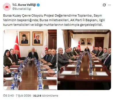 İlgili toplantının fotoğrafları, valiliğin resmi sosyal medya hesabından “Bursa Kuzey Çevre Otoyolu Projesi Değerlendirme Toplantısı, Sayın Valimizin başkanlığında; Bursa milletvekilleri, AK Parti İl Başkanı, ilgili kurum temsilcileri ve bölge muhtarlarının katılımıyla gerçekleştirildi” ifadeleriyle paylaşıldı.
