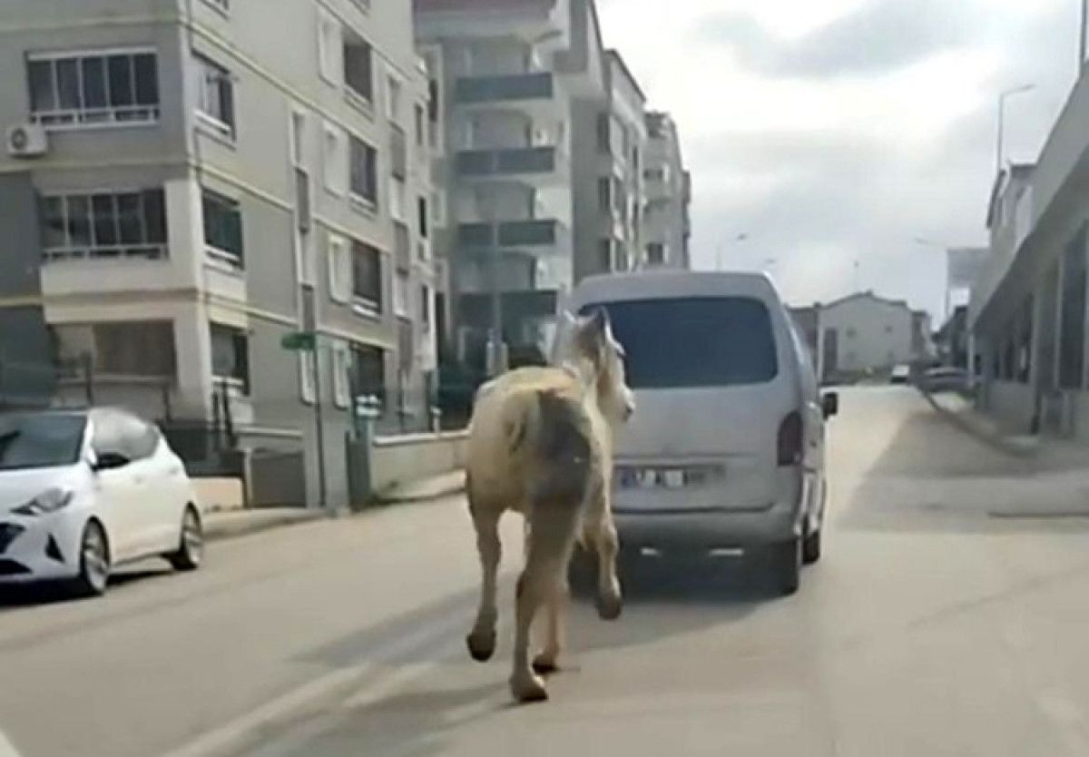 Dakikalarca zavallı hayvanı koşturan sürücü, trafiği de tehlikeye düşürürken durumu gören vatandaşlar ise tepki gösterdi. O anlar kameraya saniye saniye yansıdı.