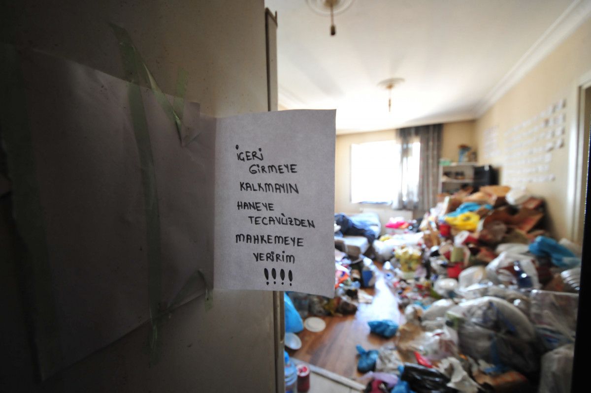 Kapının açılmasının ardından ekipler, çöp evle karşılaştı. Evin giriş kapısının yanındaki dolaba yapıştırılan kağıtta ise ‘Eve girmeye kalkmayın sizi haneye tecavüzden mahkemeye veririm!’ yazıldığı görüldü.