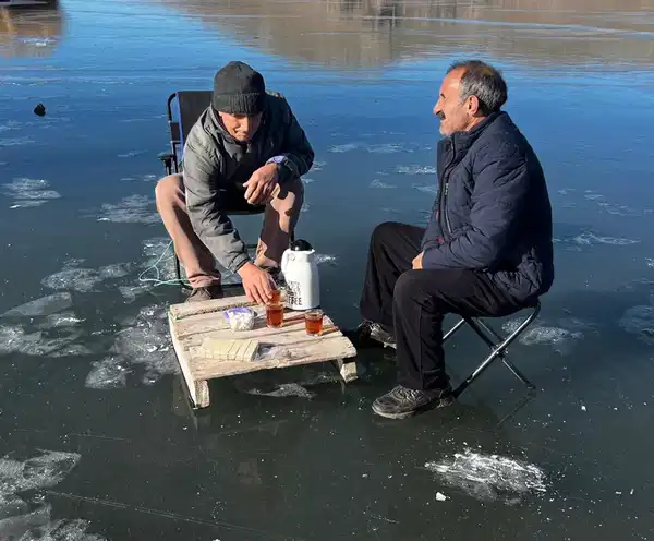 Hava sıcaklığının geceleri sıfırın altında 15 dereceye kadar düştüğü bölgede, Çıldır Gölü’ne gelen balıkçılar, avlanma öncesi kontrollerini yaptı. Doğruyol köyünde yaşayan balıkçı Atanur Dursun, arkadaşı Çetin Cengiz ile buzu inceledikten sonra göl yüzeyine koydukları sandalyelerle çay keyfi yaşadı. Çocukların da kızaklarla kaydığı gölde termosla getirdikleri çayı yudumlayan Atanur Dursun, “Hava güzel. Buzun üstende bir çay içelim dedik. Çay keyfi buzun üzerinde güzel oluyor. Çocuklar da kızak kayıyor. Yakında da inşallah ağlarımızı atarak balık avına başlarız. Buzu kontrol ettik sağlamlığına baktık. Buz sağlam ancak 2-3 gün daha bekleyip sonra ağlarımızı atmaya başlayacağız” diye konuştu.