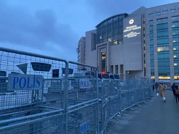 Çok sayıda Çevik Kuvvet ekibi ve TOMA, adliye önünde demir bariyerlerle çevrili bölümde hazır bulunuyor.