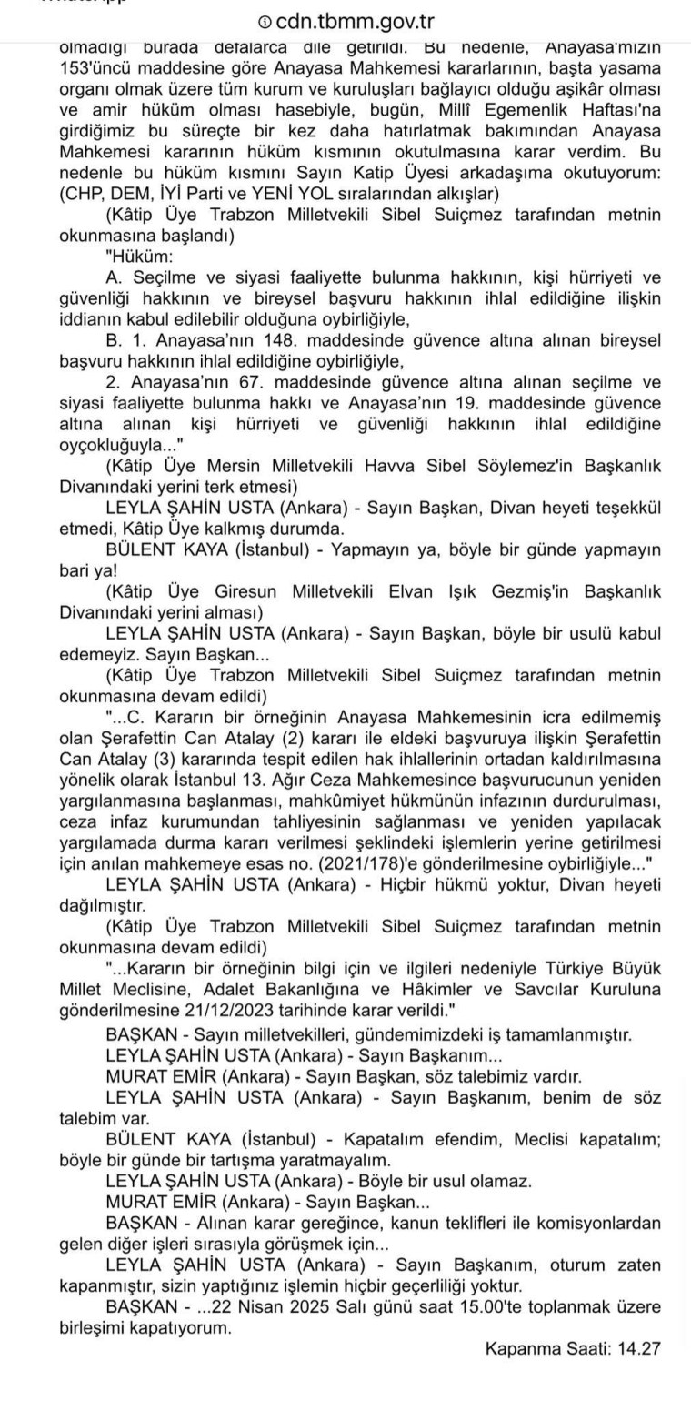 Yeni gelişmeyi paylaşan TİP İstanbul Milletvekili Sera Kadıgil, kararın açıklandığı TBMM diyaloglarının sisteme yeniden yüklendiğini açıkladı. Kadıgil, “Can Atalay’la ilgili AYM Kararının okunduğu fasıl 6 saatin ardından nihayet tekrar sisteme yüklendi. Teşekkürler. Zahmet verdik” dedi.