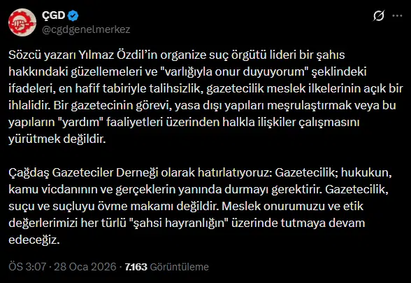 Çağdaş Gazeteciler Derneği olarak hatırlatıyoruz: Gazetecilik; hukukun, kamu vicdanının ve gerçeklerin yanında durmayı gerektirir. Gazetecilik, suçu ve suçluyu övme makamı değildir. Meslek onurumuzu ve etik değerlerimizi her türlü ‘şahsi hayranlığın’ üzerinde tutmaya devam edeceğiz.”