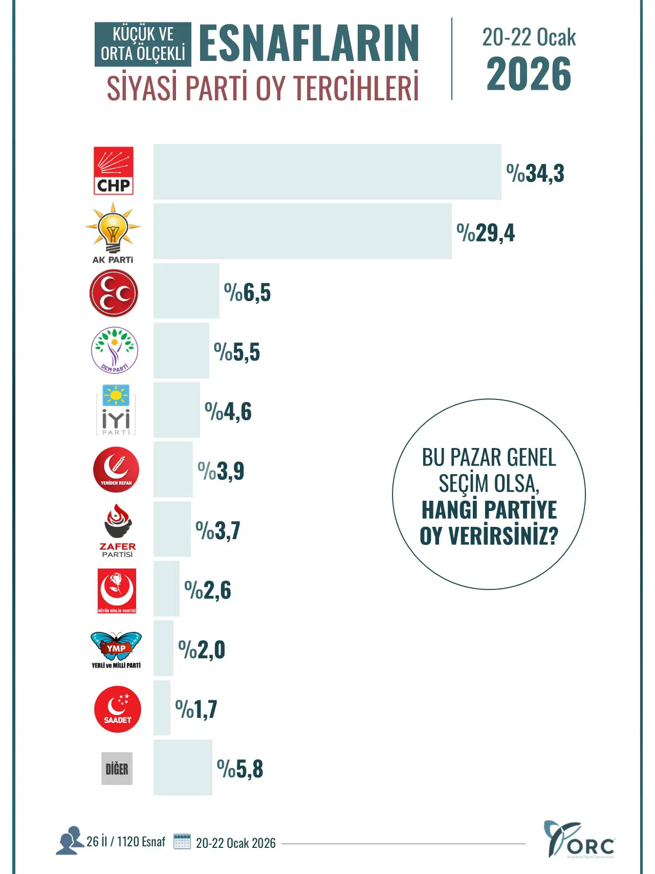 20-22 Ocak tarihleri arasında 26 ilde bin 120 küçük ve orta ölçekli esnafla yapılan ankette, esnaflara, “Bu pazar genel seçim olsa hangi partiye oy verirdiniz” sorusu yöneltildi.