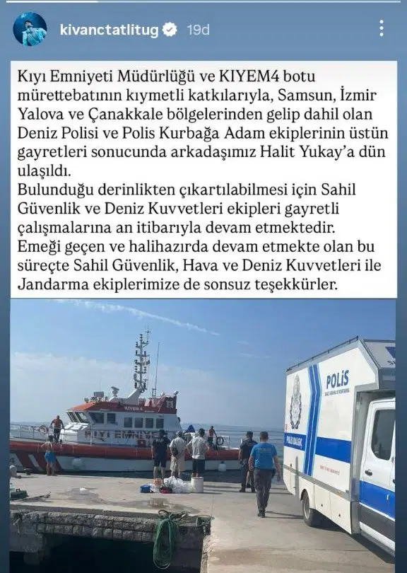 “Kıyı Emniyeti Müdürlüğü ve KIYEM4 botu mürettebatının kıymetli katkılarıyla, Samsun, İzmir Yalova ve Çanakkale bölgelerinden gelip dahil olan Deniz Polisi ve Polis Kurbağa Adam ekiplerinin üstün gayretleri sonucunda arkadaşımız Halit Yukay’a dün ulaşıldı.