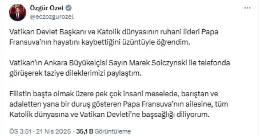 CHP Genel Başkanı Özgür Özel, sosyal medya hesabından paylaştığı mesajında, Papa Franciscus‘un hayatını kaybettiğini üzüntüyle öğrendiğini belirtti.