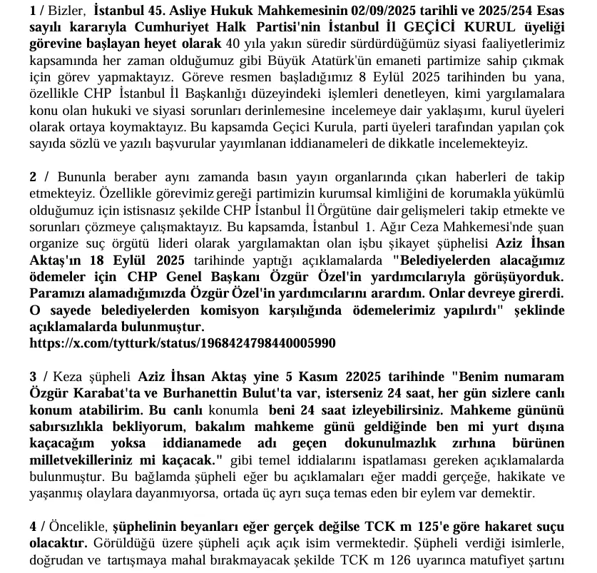 CHP İstanbul İl Başkanlığı’na kayyum olarak atanan Gürsel Tekin, Zeki Şen ve Erkan Narsap, İBB’ye yönelik soruşturma kapsamında tutuklanmasının ardından etkin pişmanlıktan yararlanarak serbest bırakılan ve 704 yıla kadar hapsi istenen Aziz İhsan Aktaş hakkında suç duyurusunda bulundu.