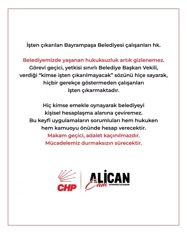 “Belediyemizde yaşanan hukuksuzluk artık gizlenemez. Görevi geçici, yetkisi sınırlı Belediye Başkan Vekili, verdiği ‘kimse işten çıkarılmayacak’ sözünü hiçe sayarak, hiçbir gerekçe göstermeden çalışanları işten çıkarmaktadır. Hiç kimse emekle oynayarak belediyeyi kişisel hesaplaşma alanına çeviremez. Bu keyfî uygulamaların sorumluları hem hukuken hem kamuoyu önünde hesap verecektir. Makam geçici, adalet kaçınılmazdır. Mücadelemiz durmaksızın sürecektir.”