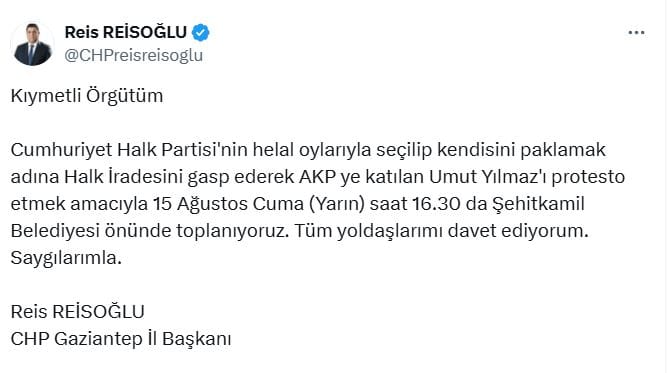 “Kıymetli Örgütüm Cumhuriyet Halk Partisi’nin helal oylarıyla seçilip kendisini paklamak adına Halk İradesini gasp ederek AKP ye katılan Umut Yılmaz’ı protesto etmek amacıyla 15 Ağustos Cuma (Yarın) saat 16.30 da Şehitkamil Belediyesi önünde toplanıyoruz. Tüm yoldaşlarımı davet ediyorum. Saygılarımla.”