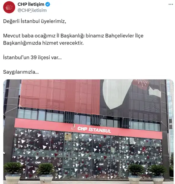CHP, mevcut İstanbul İl Başkanlığı binasının Genel Başkan Özgür Özel’in çalışma ofisi olarak kullanılacağını, Bahçelievler İlçe Başkanlığı binasının ise yeni İstanbul İl Başkanlığı binası olarak kullanılacağını açıkladı.