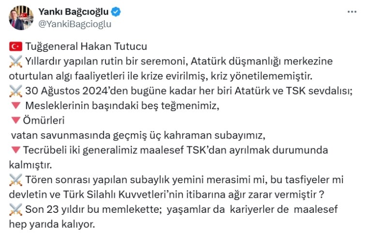 “Tuğgeneral Hakan Tutucu. Yıllardır yapılan rutin bir seremoni, Atatürk düşmanlığı merkezine oturtulan algı faaliyetleri ile krize evirilmiş, kriz yönetilememiştir. 30 Ağustos 2024’den bugüne kadar her biri Atatürk ve TSK sevdalısı; mesleklerinin başındaki beş teğmenimiz, ömürleri vatan savunmasında geçmiş üç kahraman subayımız, tecrübeli iki generalimiz maalesef TSK’dan ayrılmak durumunda kalmıştır. Tören sonrası yapılan subaylık yemini merasimi mi, bu tasfiyeler mi devletin ve Türk Silahlı Kuvvetleri’nin itibarına ağır zarar vermiştir? Son 23 yıldır bu memlekette; yaşamlar da kariyerler de maalesef hep yarıda kalıyor.”