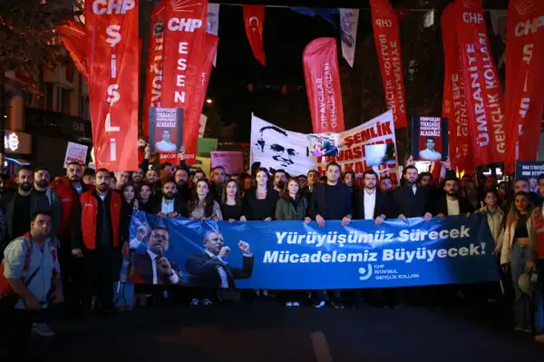 CHP İstanbul Gençlik Kolları üyeleri, Şişli Atatürk Evi Müzesi’nden Mecidiyeköy’e yürüyerek mitinge katıldı. Yürüyüşte tutuklu Şişli Belediye Başkanı Resul Emrah Şahan’ın özgürlüğü için sloganlar atıldı.