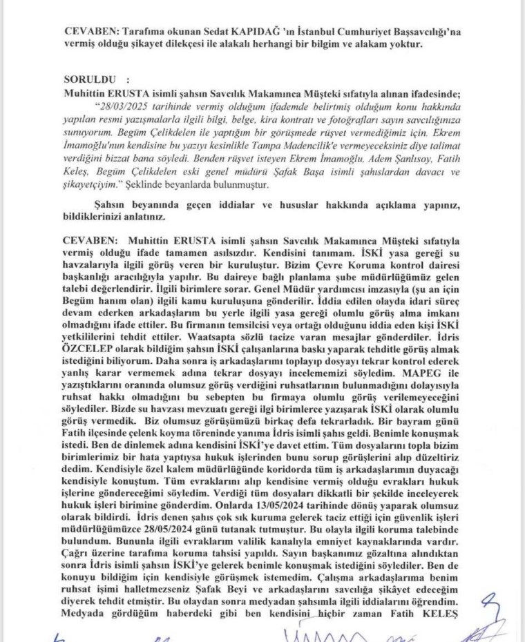 Ancak aynı kişi, 28 Mart’ta savcılığa gidip “İSKİ Genel Müdürü ve Ekrem İmamoğlu benden rüşvet istedi, vermeyince ruhsatımı vermediler” diyerek şikâyette bulunuyor. Ortada belge yok, kanıt yok, sadece tek bir kişinin sözleri var.