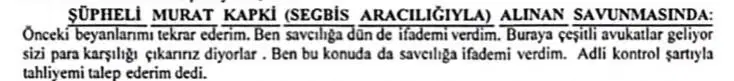 “İstanbul 11. Sulh Ceza Hakimliği tarafından 8.8.2025 tarihinde yapılan tutukluluk incelemesinde, Murat Kapki adlı işadamı; “buraya gelen çeşitli avukatlar, sizi para karşılığı çıkarırız diyorlar. Ben dün bu konuda savcılığa ifade verdim” şeklinde segbis aracılığıyla ifade veriyor.