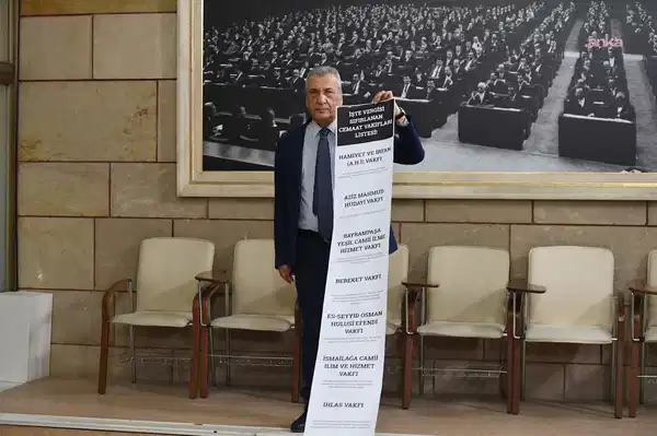 Vergiden muaf tutulan cemaat vakıfları olduğunu belirttiği isimlerin yazılı olduğu 7 metreden oluşan ruloyu salona yayan Öztürkmen, vakıfları şöyle sıraladı: