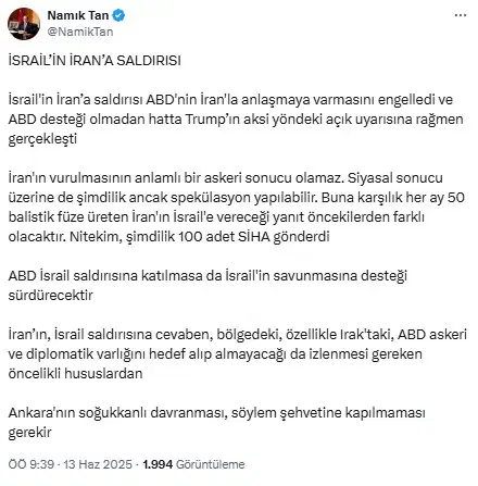 Tan, sosyal medya platformu X’teki hesabı üzerine yaptığı açıklamada, İran’a saldırının ABD’nin İran’la anlaşmaya varmasını engellediğini belirterek “ABD desteği olmadan hatta Trump’ın aksi yöndeki açık uyarısına rağmen gerçekleşti” dedi.
