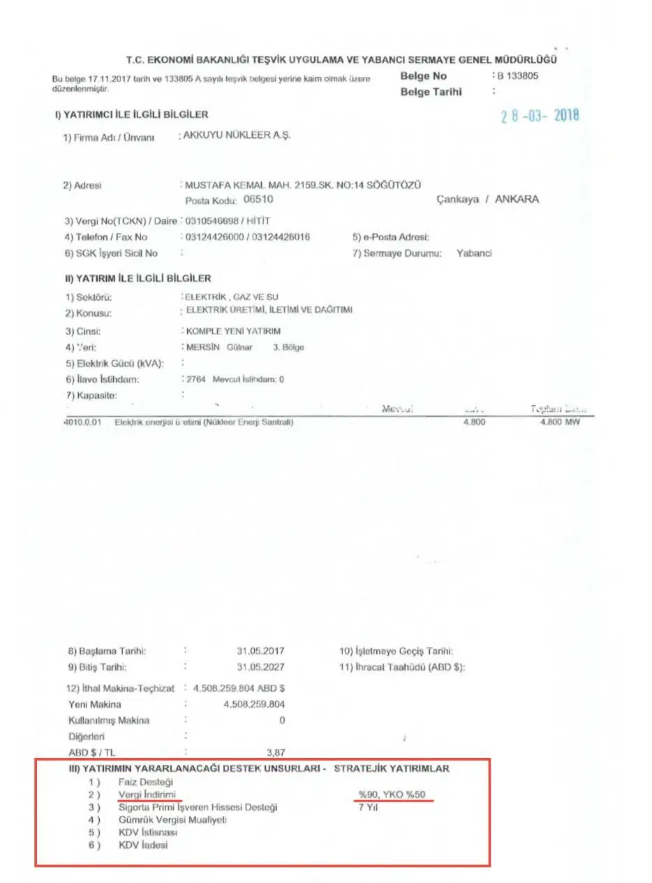 Yavuzyılmaz, sosyal medya platformu X üzerinden gerçekleştirdiği paylaşımda, Ekonomi Bakanlığı tarafından Akkuyu Nükleer A.Ş. adına düzenlenen yatırım teşvik belgesine ilişkin verileri yayımladı.