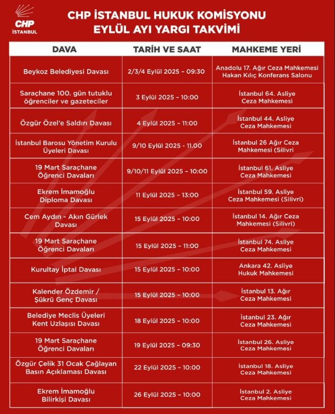 Eylül ayında CHP ve CHP’liler ile ilgili davaların duruşmaları görülecek.