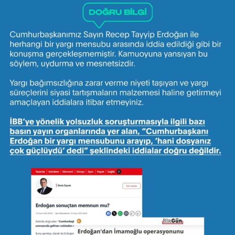 “Cumhurbaşkanımız Sayın Recep Tayyip Erdoğan ile herhangi bir yargı mensubu arasında iddia edildiği gibi bir konuşma gerçekleşmemiştir. Kamuoyuna yansıyan bu söylem, uydurma ve mesnetsizdir.”