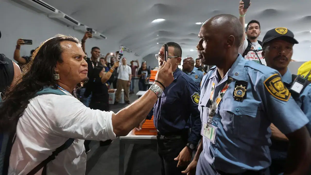 Onlarca yerli protestocu, zirvenin yapıldığı alana bariyerleri aşarak girdi ve güvenlik görevlileriyle çatıştı.
