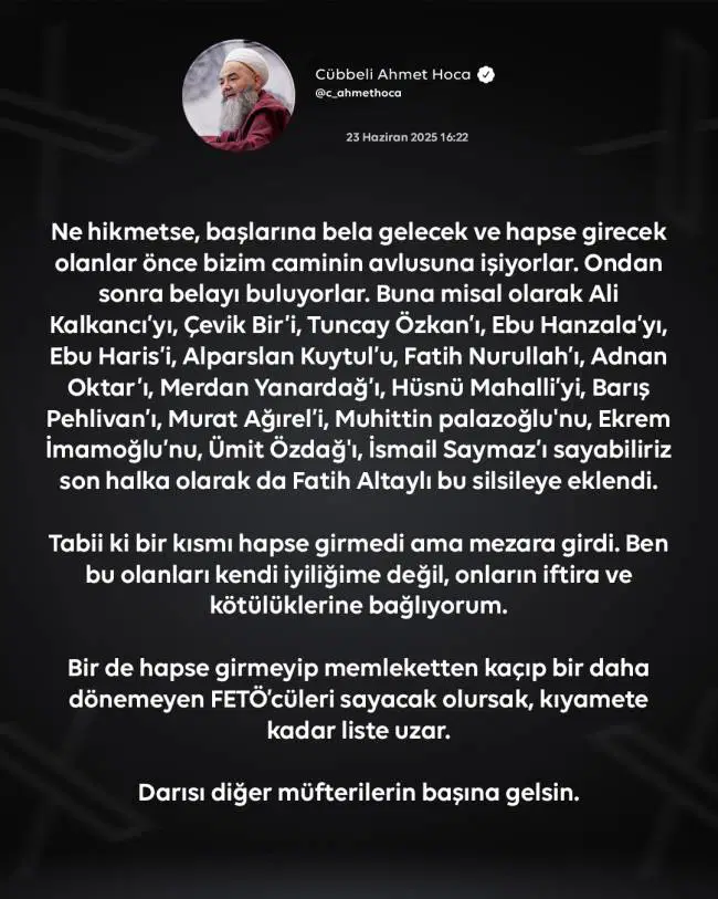 “Ne hikmetse, başlarına bela gelecek ve hapse girecek olanlar önce bizim caminin avlusuna işiyorlar. Ondan sonra belayı buluyorlar. Buna misal olarak Ali Kalkancı’yı, Çevik Bir’i, Tuncay Özkan’ı, Ebu Hanzala’yı, Ebu Haris’i, Alparslan Kuytul’u, Fatih Nurullah’ı, Adnan Oktar’ı, Merdan Yanardağ’ı, Hüsnü Mahalli’yi, Barış Pehlivan’ı, Murat Ağırel’i, Muhittin Palazoğlu’nu, Ekrem İmamoğlu’nu, Ümit Özdağ’ı, İsmail Saymaz’ı sayabiliriz son halka olarak da Fatih Altaylı bu silsileye eklendi.