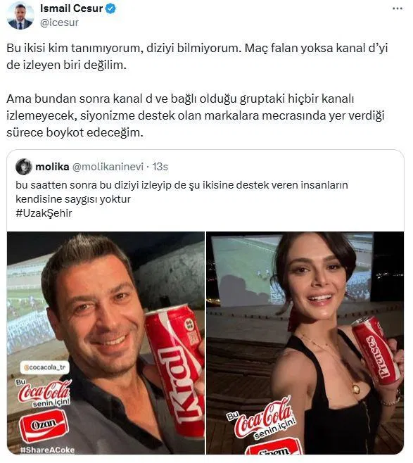 “Bu ikisi kim tanımıyorum, diziyi bilmiyorum. Maç falan yoksa kanal d’yi de izleyen biri değilim. Ama bundan sonra kanal d ve bağlı olduğu gruptaki hiçbir kanalı izlemeyecek, siyonizme destek olan markalara mecrasında yer verdiği sürece boykot edeceğim.