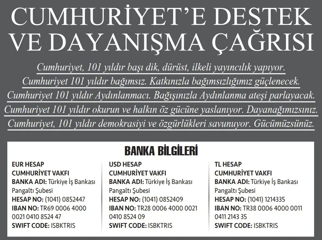 Gazetemiz Cumhuriyet Okurları’nın (CUMOK) öncülüğünde başlatılan Cumhuriyet imecesine destek ve dayanışma çağrıları artarak sürüyor.