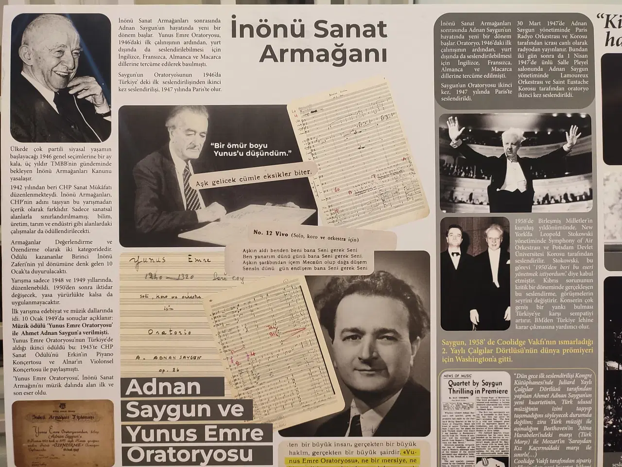 Sergide dikkat çeken parçalardan biri de 1948 yılında İnönü Sanat Armağanı yarışmasını kazanan Ahmet Adnan Saygun’a verilen diploma… “Yunus Emre Oratoryosu” ile ödüle layık görülen Saygun’a ait bu belge de, ilk kez bu sergide sanatseverlerle buluşuyor.