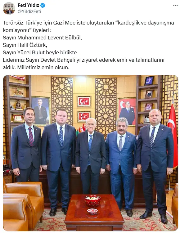 MHP’nin söz konusu komisyon için ismini yazdırdığı Genel Başkan Yardımcısı Feti Yıldız, Sakarya Milletvekili Muhammet Levent Bülbül, Kırıkkale Milletvekili Halil Öztürk ve Tokat Milletvekili Yücel Bulut, bugün MHP Genel Merkezi’nde Devlet Bahçeli‘yi ziyaret etti.