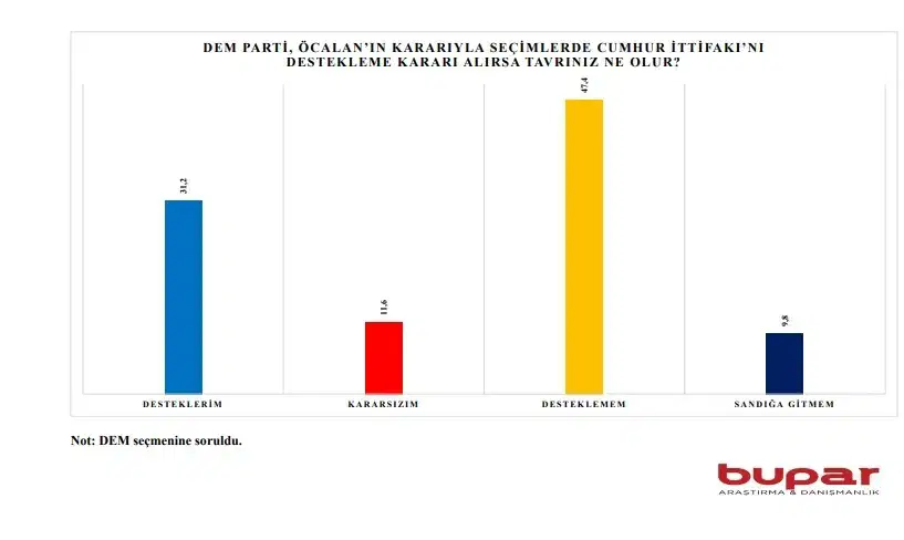 Araştırmaya göre, “Öcalan’ın çağrısı doğrultusunda DEM Parti Cumhur İttifakı’nı destekleme kararı alırsa tavrınız ne olur?” sorusuna DEM seçmeninin yüzde 70’ten fazlası “desteklemem” yanıtını verdi.