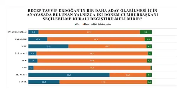 Araştırmada seçmenlere AKP’li Cumhurbaşkanı Recep Tayyip Erdoğan’ın yeniden aday olabilmesi için anayasadaki iki dönem kuralının değiştirilmesine karşı tutumlarının ne olacağı soruldu. Buna göre, katılımcıların yüzde 71,2’si bu değişikliğe karşı olduğunu bildirdi.