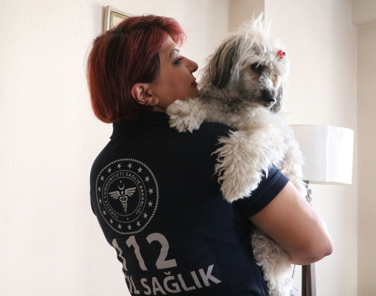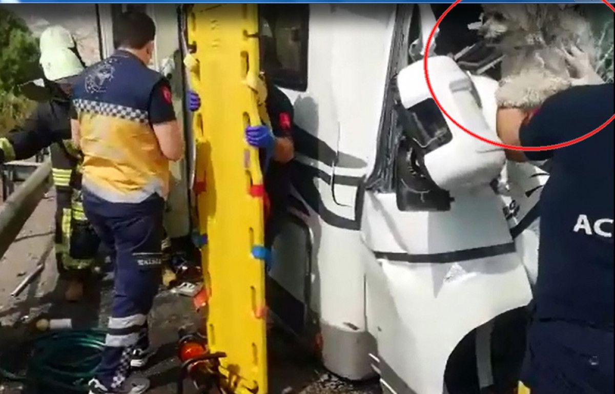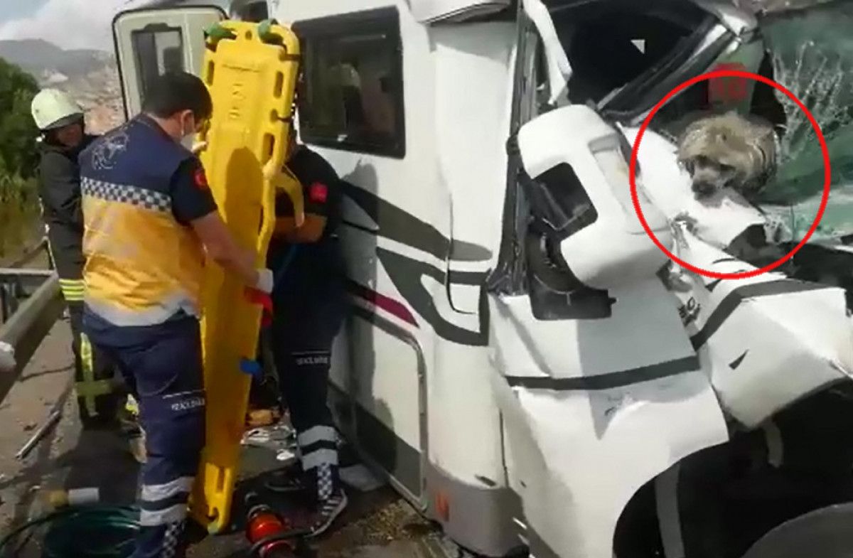 Bu sırada, olay yerine sevk edilen acil sağlık ekibinden ambulans hemşiresi Emine Kaplan’ın (45) kucağına, karavanın kırılan ön camından terrier cinsi köpek atladı.