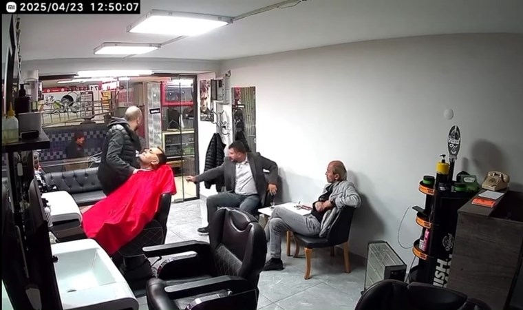 Tıraş olan kişi koltukta kalırken, sıra bekleyen 2 müşteri de kendisini dışarı attı. Yaşananlar güvenlik kamerasına yansıdı.