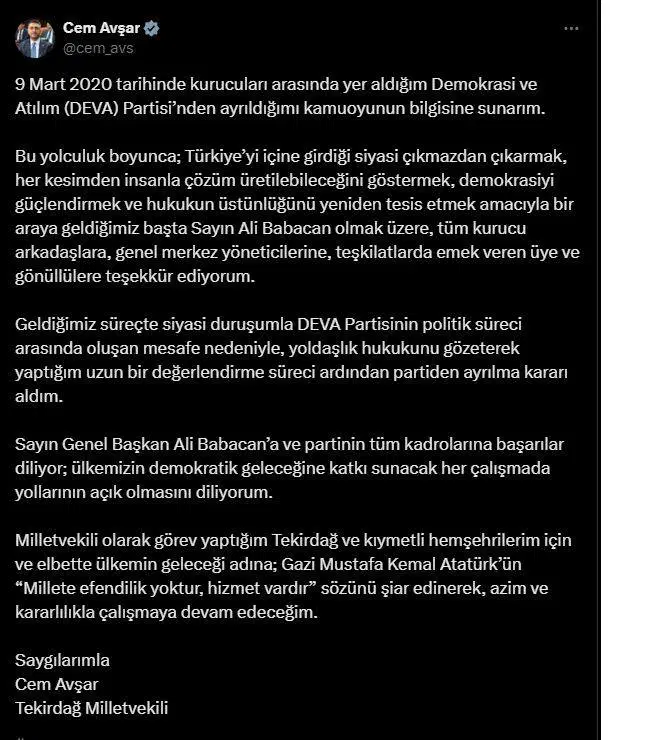 Avşar, “Geldiğimiz süreçte siyasi duruşumla DEVA Partisinin politik süreci arasında oluşan mesafe nedeniyle, yoldaşlık hukukunu gözeterek yaptığım uzun bir değerlendirme süreci ardından partiden ayrılma kararı aldım” dedi.