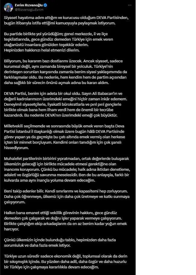 İstanbul Milletvekili Evrim Rızvanoğlu, “Biliyorum, bu kararım bazı dostlarımı üzecek. Ancak siyaset, sadece kurumsal değil, aynı zamanda bireysel bir yolculuk. Türkiye’nin derinleşen sorunları karşısında zamanla benim siyasi yaklaşımımda da farklılaşmalar oldu. Bu nedenle, hem kendim hem de partim açısından daha sağlıklı bir sürecin önünü açmak adına bu kararı aldım” diyerek istifa kararını duyurdu.