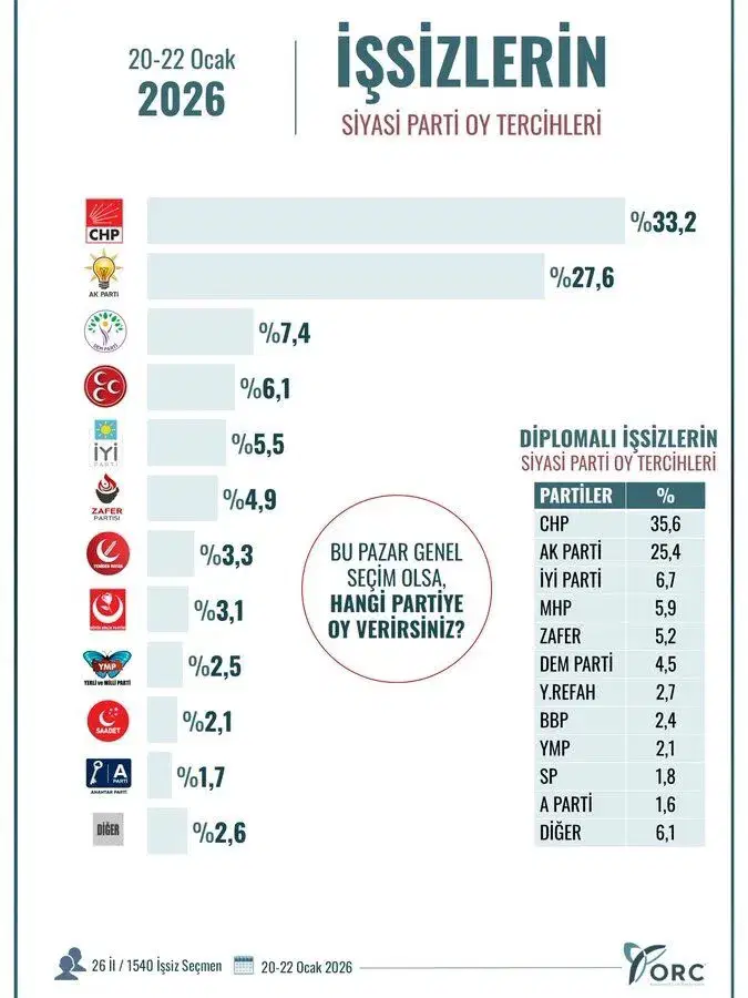 ORC Araştırma, 20-22 Ocak 2026 tarihlerinde gerçekleştirdiği son anket çalışmasıyla işsiz vatandaşların siyasi eğilimlerini mercek altına aldı.