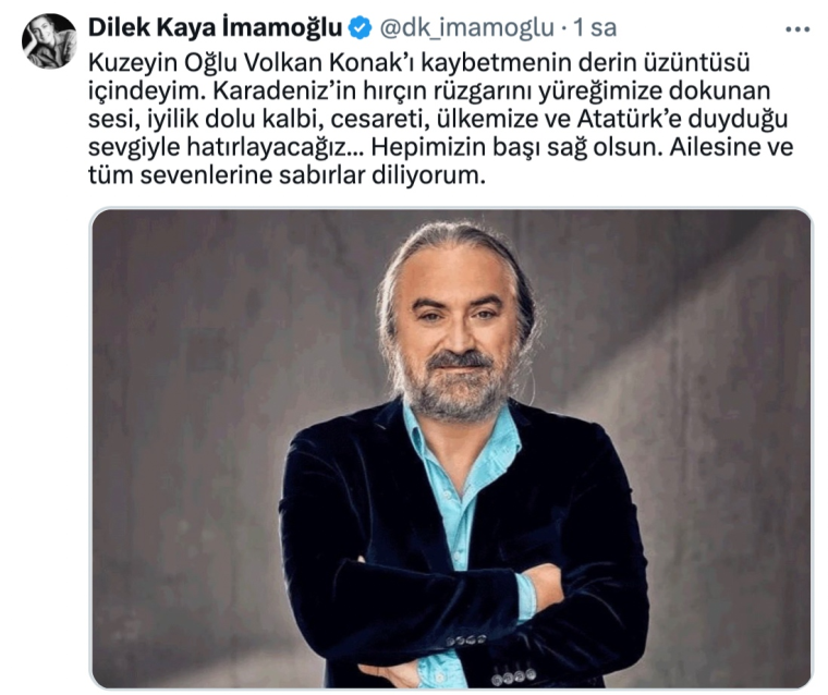 “Kuzeyin Oğlu Volkan Konak’ı kaybetmenin derin üzüntüsü içindeyim. Karadeniz’in hırçın rüzgarını yüreğimize dokunan sesi, iyilik dolu kalbi, cesareti, ülkemize ve Atatürk’e duyduğu sevgiyle hatırlayacağız… Hepimizin başı sağ olsun. Ailesine ve tüm sevenlerine sabırlar diliyorum.”