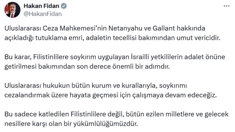 Dışişleri Bakanı Fidan, Uluslararası Ceza Mahkemesi’nin İsrail Başbakanı Benjamin Netanyahu ile İsrail Savunma Bakanı Yoav Gallant hakkındaki tutuklama kararına ilişkin sosyal medya hesabından bir açıklama yayımladı.