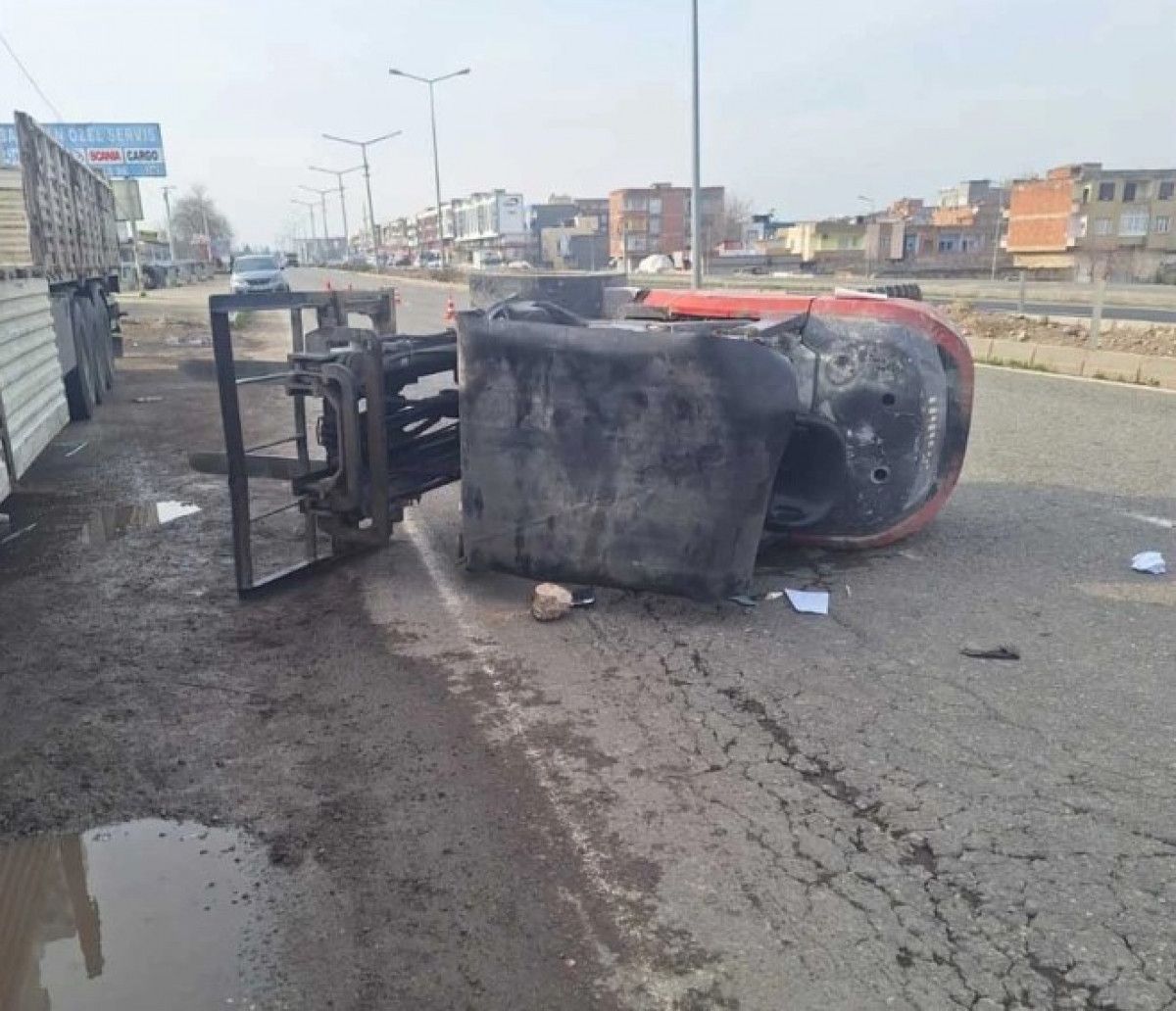 Bismil ilçesinde yaşanan olayda, özel bir firmada çalışan Hasan Altuğ (24), bir tırın içerisindeki seramik karoları indirdiği sırada kullandığı forklift devrildi.