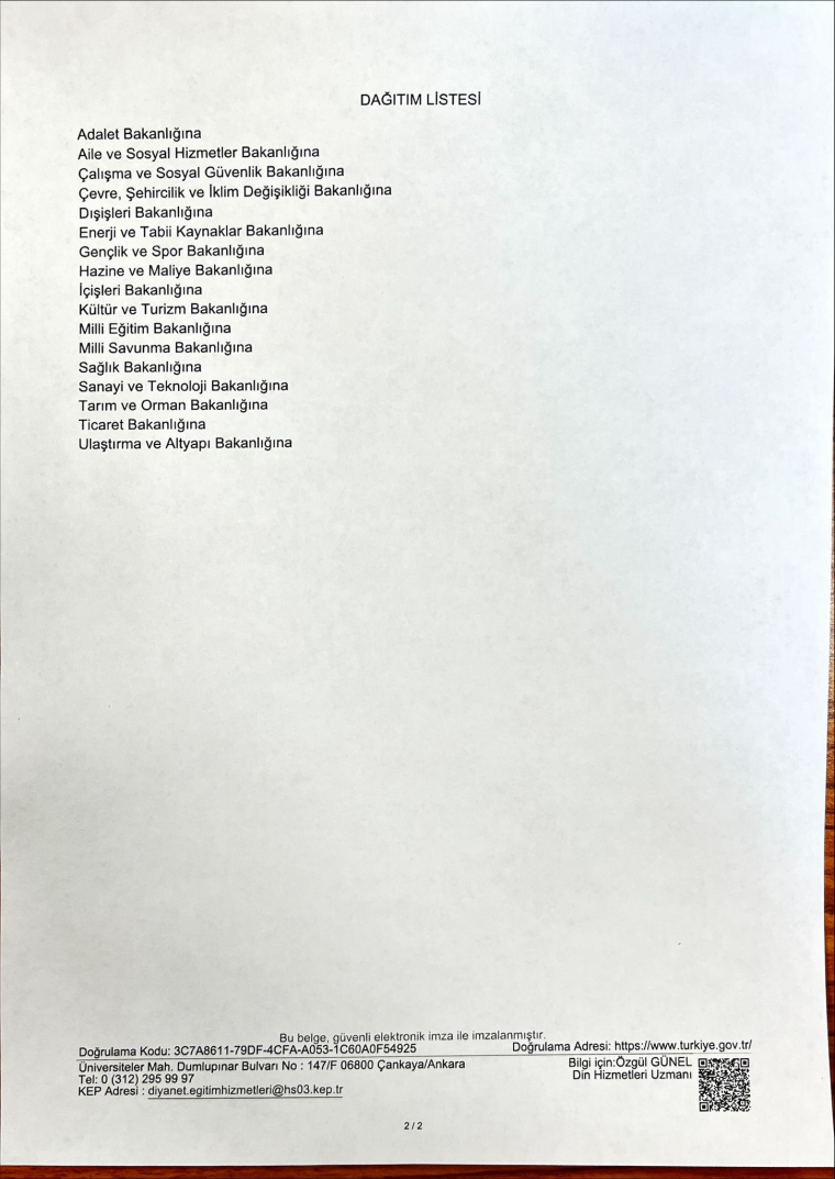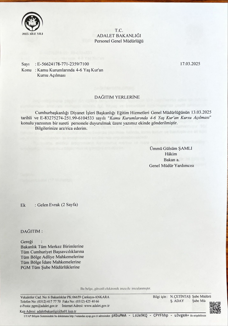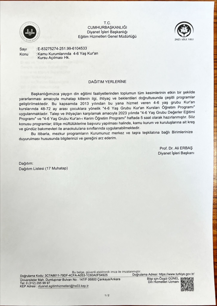 Diyanet Eğitim Hizmetleri Genel Müdürlüğü; “2025 Aile Yılı” kapsamında 13 Mart’ta 17 bakanlığa bir yazı gönderdi. Söz konusu yazıda; kamu kurum ve kuruluşlarına ait kreş, gündüz bakımevleri ve anaokullarında il-ilçe müftülüklerine başvuru yapılarak “4-6 Yaş Grubu Değerler Eğitimi Programı” ile “4-6 Yaş Grubu Kuran Öğretim Programı” kapsamında haftada 5 saat ders verilebileceği belirtildi.
